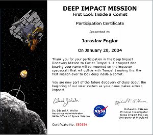 Planetku Foglar jistě už pozorní čtenáři Bohouška znají - např. zde. Už méně známo je, že Foglarovo jméno se dostalo znova do vesmíru díky kometě Tempel 1 a sondě Deep Impact v rámci projektu Discovery. Dva dny před připomenutím nedožitých 98 let od narození spisovatele Jaroslava Foglara 4. července 2005 v 7:52 SELČ úspěšně zasáhl impaktor sondy Deep Impact jádro komety Tempel 1. Při rychlosti sondy a komety (cca 10 km/s) a hmotnosti impaktoru (370 kilogramů) o velikosti ledničky se uvolnilo 19 gigajoulů energie (takřka 5 tun TNT). Kometa Tempel 1 má pod povrchem materiál z dob formování sluneční soustavy. Jaroslav Foglar ...... resp. jeho jméno se stalo součástí teto vesmírné srážky, protože bylo (díky Bohouškovi) zaznamenáno na malém CD disku. Certifikát s číslem 559834 vydaný 28. ledna 2004 pro Jaroslava Foglara najdete ZDE.