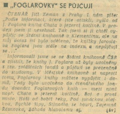 Čtenář Jiří Zeman z Prahy 1 nám píše: „Podle informací, které jste otiskli, vyšla od J. Foglara kniha Chata v Jezerní kotlině. V prodejně jsem ji nesehnal. Tak jsem si ji chtěl vypůjčit ve Státní knihovně v Klementinu, ale na můj dotaz mi bylo sděleno, že knížky Jaroslava Foglara jsou stále na indexu a nepůjčují se …“Informovali jsme se ve Státní knihovně ČSR a zjistili, že knihy J. Foglara už byly uvolněny z tzv. zvláštních fondů a půjčují se prezenčně do studovny. V Městské knihovně si naproti tomu Foglarovy knihy můžete vypůjčit i domů. … (šv)