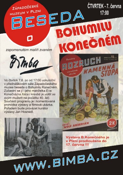 Pozvánka na besedu o Bimbovi Ve čtvrtek 7.6. se od 17:00 uskuteční v přednáškovém sále Západočeského muzea beseda o B. Konečném. Zúčastní se jí manželka B.Konečného Eva Konečná. (na fotce i kresbě je vidět se svým mužem na začátku 40. let) Součástí programu je i komentovaná prohlídka výstavy a filmová ukázka. Pořadem bude provázet kurátor výstavy Jan Hosnedl - Housenka. Připomínáme, že výstava je v Plzni prodloužena do 17. června. Podrobnosti na www.bimba.cz.