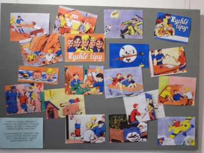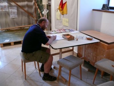 Dílem okamžiku byl přesun přes náměstí kolem dvou barevných plakátků avizujících výstavu do domu Mince. Zde jsme si prohlédli prodejnu se suvenýry (k dispozici 3 foglarovské pohlednice, výroční turistická známka, knihy Stoletý hoch od Bobří řeky a Zápisník 13 bobříků) a zakoupili vstupenky. Ty nás překvapily svojí strohostí - jde totiž o pouhý pokladní blok. Pak nás už místní průvodce uvedl do suterénních prostor, kde probíhají krátkodobé výstavy a s několika slovy o Jaroslavu Foglarovi, a také informací, že další výstavy probíhají v Praze a Brně, nás propustil.