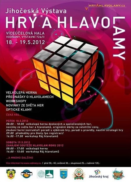 Hry a hlavolamy ve Vodňanech přinesou zajímavý program. Připravena je obrovská herna deskových her, výstavní vitríny plné hlavolamů a také workshopy, na nichž si pod dozorem herních instruktorů vyzkoušíte svůj um při řešení hlavolamů všech stupňů obtížnosti. Workshopy proběhnou v pátek v 16 hodin a v sobotu ve 14 hodin. Z deskových her upozorňujeme na novou řadu SMART GAMES, která je populární svým řešením, kdy úkoly jsou řazeny od těch jednoduchých k nejsložitějším. Jedná se o solitérní hru (jako hlavolam), ale řešení v kolektivu je ještě více vzrušující. Distributor her - společnost MINDOK získal i několik ocenění.