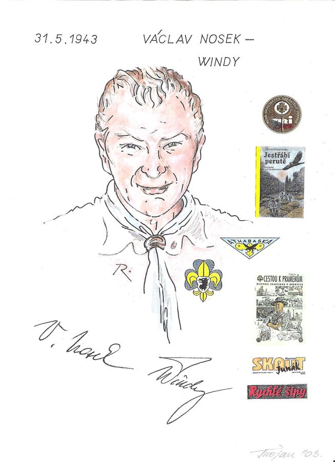 Truhlu pokladů Václav Nosek – Windy plní již sedmdesát let[ Autor: Jan Trojan - Roy | zařazeno: 22. 6. 2013 | přečteno 14256 ] Všichni jistě známe KPZ – Krabičku Poslední Záchrany a víme skoro přesně, co v ní má být, aby nás pak v nouzi nejvyšší zachránila a pomohla nám. Ne všichni ale také známe a máme KKP – Krabičku Klukovských Pokladů. V té můžeme mít všecko možné, různé ,,malé,, věci, malé svou velikostí, ale velké svým příběhem a zážitkem. Jsou to věci, které máme rádi a které jsou pro nás důležité, něco milého a zajímavého nám připomínají, nebo jsme je od někoho dostali na památku a velice si jich vážíme či jsme je jen horko-těžko sháněli a je to takzvaně naše srdeční záležitost, máme k nim svůj zvláštní osobní vztah. Všeobecně a laicky řečeno - je to taková naše Truhla pokladů - a takovou podobnou Truhlu pokladů má určitě i Václav Nosek - Windy, který tento rok 31. 5. oslavil své krásné 70. narozeniny. Věřím, že všichni správně tušíte, že tou Windyho Truhlou pokladů nemám na mysli jeho comix o skautech a skautkách z družin Ještěrek a Rysů, nazvaný také Truhla pokladů, ale že tím myslím jeho KKP – Krabičku Klukovských Pokladů. V té své Truhle pokladů má Windy určitě uloženy všechny krásné vzpomínky na své dětství, na své první, bývalé i současné lásky, na své rodiče, sourozence, děti i vnoučata, přátele, na setkání a setkávání se s Rychlými šípy a Jaroslavem Foglarem, na skautování, první poštovní známky, odznaky, ježky v kleci i na Památník národního písemnictví a své první psaní článků a knížek, na spoustu krásných výstav a kdo ví na co ještě… A i když víme, že velice rád nechává své přátele a obdivovatele do této své Truhly pokladů nahlédnout, to, co tam doopravdy všechno má, ví nejlépe jen on sám a to je dobře. Takže Ti, Windy, k tvým kulatým narozeninám, sice trošku opožděně, ale přece, přejeme, aby Ti všechny ty poklady, které tam v té své KKP - Truhle pokladů máš, přinášely vždy jen potěšení, radost, zábavu i poučení a někdy i chvilky k zamyšlení, krásné vzpomínky a také chuť k hledání dalších nových, nejen těch svých pokladů – děláš s nimi totiž radost i nám. Vše nejlepší a hlavně hodně zdraví! Bohoušek, SPJF, Jan Trojan – Roy