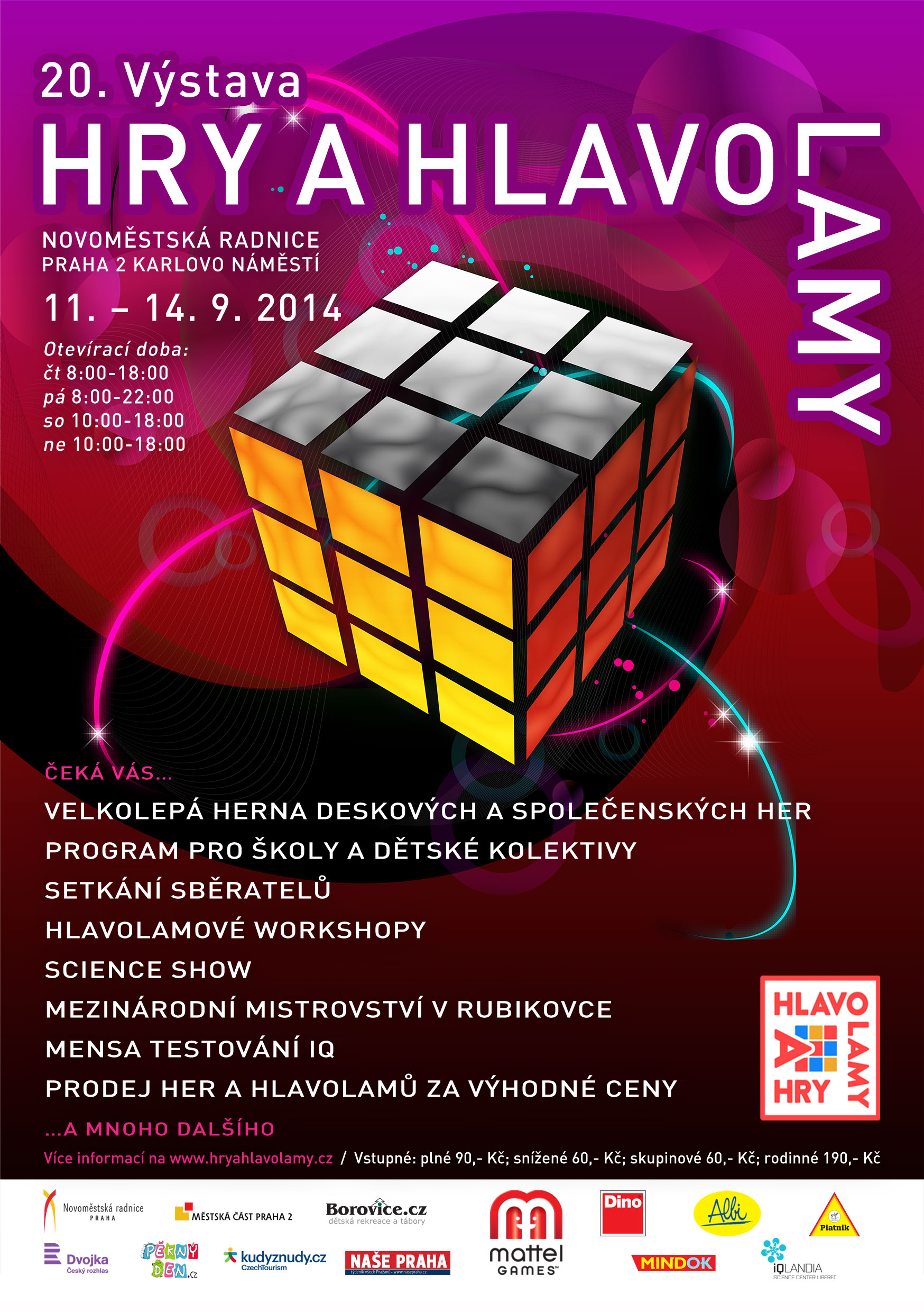 20. Výstava Hry a hlavolamy v Praze: Čtyři dny plné zábavy, her a poznávání[ Autor: | zařazeno: 6. 9. 2014 | přečteno 11253 ] V termínu 11. – 14. září 2014 proběhne v Praze 2 na Novoměstské radnici již 20. Výstava Hry a hlavolamy. Děti i dospělí návštěvníci se mohou těšit na desítky deskových her i výstavu mechanických hlavolamů ze sbírky patrona výstavy RNDr. Jaroslava Flejberka. Připravena je i řada doprovodných programů – pro školy a dětské skupiny jsou to přednášky a workshopy. Dále se mohou návštěvníci těšit na Science show i testování IQ v režii Mensa ČR a Součástí výstavy bude také dvoudenní mezinárodní mistrovství ve skládání Rubikovy kostky.Datum: 11. – 14. 9. 2014 Místo:Novoměstská radnice, Karlovo náměstí 1/23, 120 00 Praha 2 Otevírací doba: čtvrtek 8 – 18 h, pátek 8 – 22 h, sobota a neděle 10 – 18 h Vstupné: plné 90 Kč, snížené 60 Kč, rodinné 190 Kč, skupinové 60 Kč Výstava je určena pro děti i dospělé, kteří si rádi hrají, připraveno bude množství hlavolamů z celého světa, samozřejmě včetně novinek a zajímavostí. „Asi nejoblíbenější je na celé výstavě velká herna deskových her. Můžete přijít ráno a hrát si celý den v kuse. Navíc jsme letos prodloužili v pátek hernu až do 22 hodin,“ láká na výstavu její ředitel Pavel Hofrichter. V této prostorné herně se během čtyř dnů, kdy výstava probíhá, představí kolem stovky nových, ale i léty prověřených deskových her, jako je třeba oblíbená slovní hra Scrabble. Herní instruktoři všem rádi poradí s výběrem a pravidly her. Na výstavě bude možné si hry i hlavolamy koupit za výhodné ceny, vyberte si zde tedy skvělé vánoční dárky s předstihem. Ve čtvrtek a v pátek jsou na výstavě připraveny naučné programy pro školy. Jedná se o přednášky z oblasti hlavolamů, logiky, a rébusů a také workshopy, v jejichž rámci si mohou účastníci za asistence instruktorů vyzkoušet desítky hlavolamů a dozvědět se o nich mnoho zajímavostí i tipů na řešení. Mezi další lákadla patří například science show, testování IQ nebo sobotní setkání sběratelů a autorů hlavolamů. Skvělou podívanou i napětí přinese bezesporu víkendové mezinárodní mistrovství ve skládání Rubikovy kostky. Na něm se představí 15 známých i méně známých disciplín ve skládání tohoto celosvětově proslulého hlavolamu. Výstava probíhá pod záštitou starostky Městské části Praha 2 Mgr. Jany Černochové. Výstava Hry a hlavolamy ve zkratce: