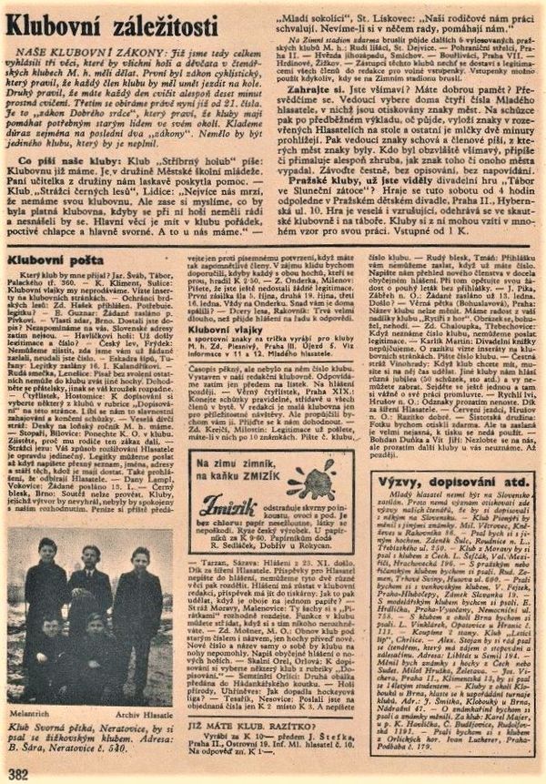Mladý hlasatel č. 24, ročník V, 10. února 1940 Klubovní stránka v rubrice Co píší naše kluby uvádí mimo jiné - Klub "Strážci černých lesů", Lidice: "Nejvíce nás mrzí, že nemáme svou klubovnu. Ale zase si myslíme, co by byla platná klubovna, kdyby se při ní hoši neměli rádi a nesnášeli by se. Hlavní věcí je mít v klubu pořádek, poctivé chlapce a hlavně svorné. A to u nás máme." Jedním z pravidelných úkolů, který měl každý klub plnit, bylo zaslat jednou za měsíc do redakce klubovní hlášení, v němž byla popsána klubovní činnost za předchozí období. Podle pokynů mělo každé hlášení začínat úvodní formulí: Klub Mladého hlasatele č. ..... Strážci černých lesů Lidice se hlásí: ... ... ... (tuto formulaci jsme záměrně použili pro titulek článku). Redakce ze všech hlášení na klubovní stránky Mladého hlasatele vybírala nejzajímavější sdělení. Vzhledem k tomu, že v únoru 1940 redakce evidovala již 6000 klubů, lze opět s povděkem přijmout to, že se na stránce dostalo právě na Strážce černých lesů.