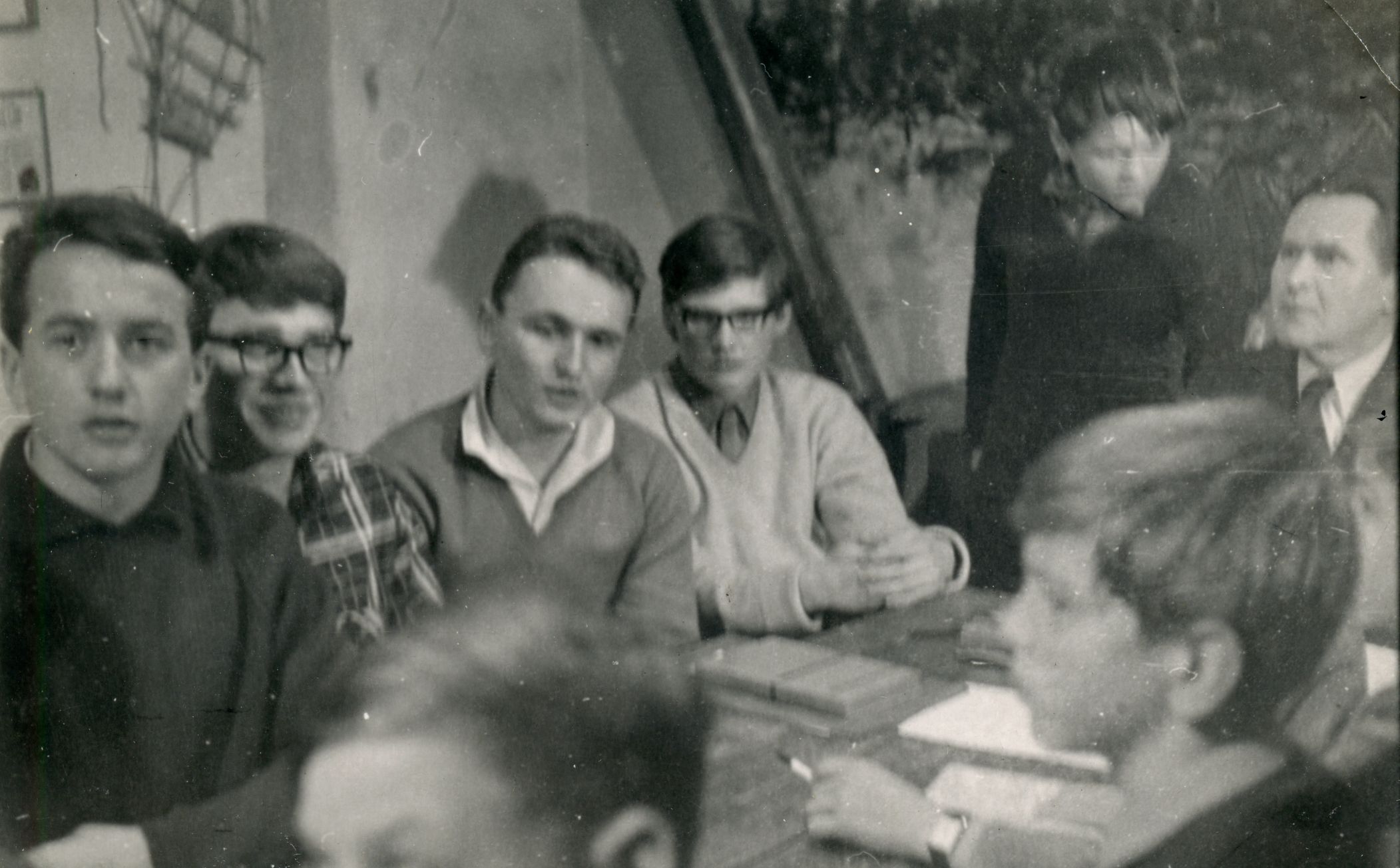 Rok 1967, klubovna v Praze-Radlicích. Zleva: Zdeněk-Jáček-Ríša-Dušan, vpravo Jestřáb. Foto: autor nezjištěn. Archiv: Jaroslav Čvančara.