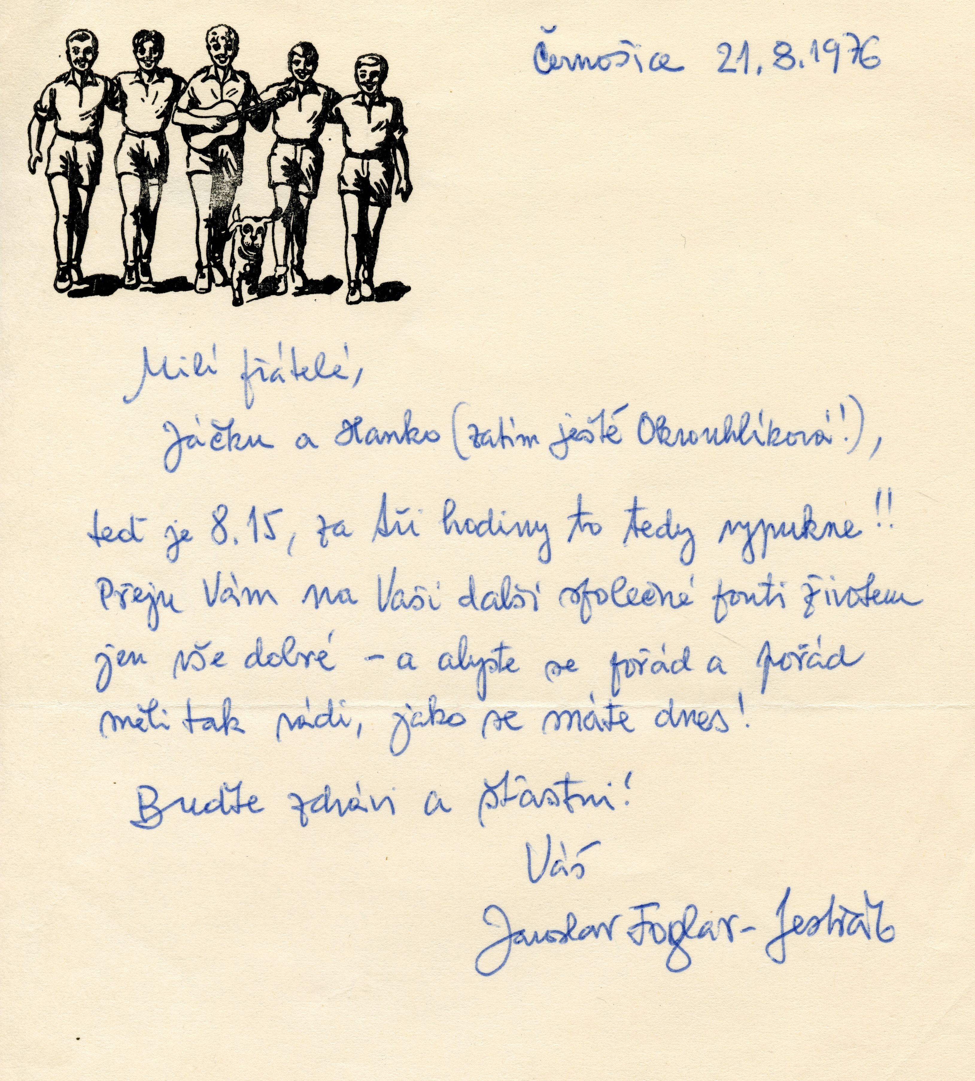 21. 8. 1976. Jestřábovo blahopřání novomanželům Čvančarovým. Přátelské kontakty s Jestřábem udržoval Jáček trvale i v dospělosti, řadu let po ukončení členství v oddíle. Archiv: Jaroslav Čvančara.