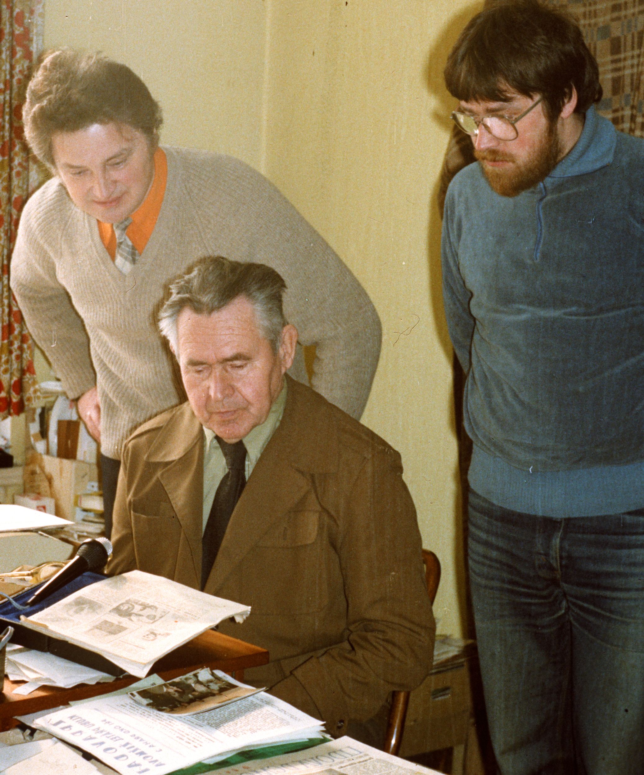27. 2. 1982. Bratři Miroslav a Jaroslav Čvančarovi s Jestřábem v jeho žižkovském bytě v Křišťanově ulici čp. 817/18. Vlevo Miroslav Čvančara, bratr Jáčka. Foto: Jiří Raba.