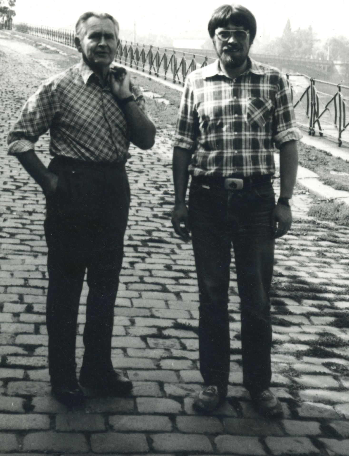 11. 9. 1982. Jaroslav Foglar a Jáček poblíž Čechova mostu, nedaleko místa, kde na Vltavě od 4. 12. 1934 kotvil nákladní parník Orlice, Jestřáb ho přejmenoval na Skaut a nechal přestavět na klubovny osmi skautských oddílů. Foto: Jiří Raba.