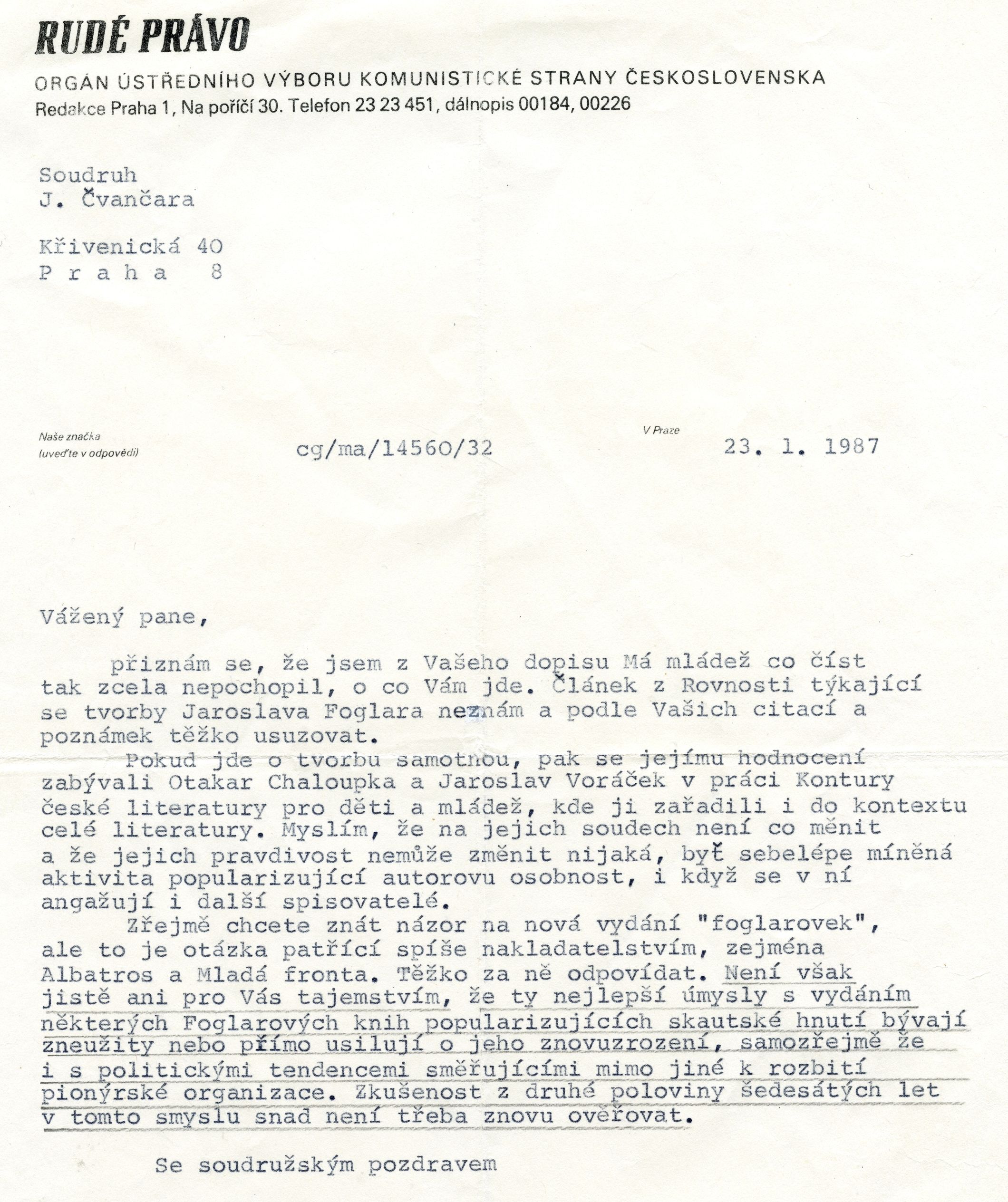 Pozoruhodná odpověď redakce Rudého práva z 23. 1. 1981 na Čvančarův dopis, proč Foglarovy knihy nemohou být vydávány. Archiv: Jaroslav Čvančara.