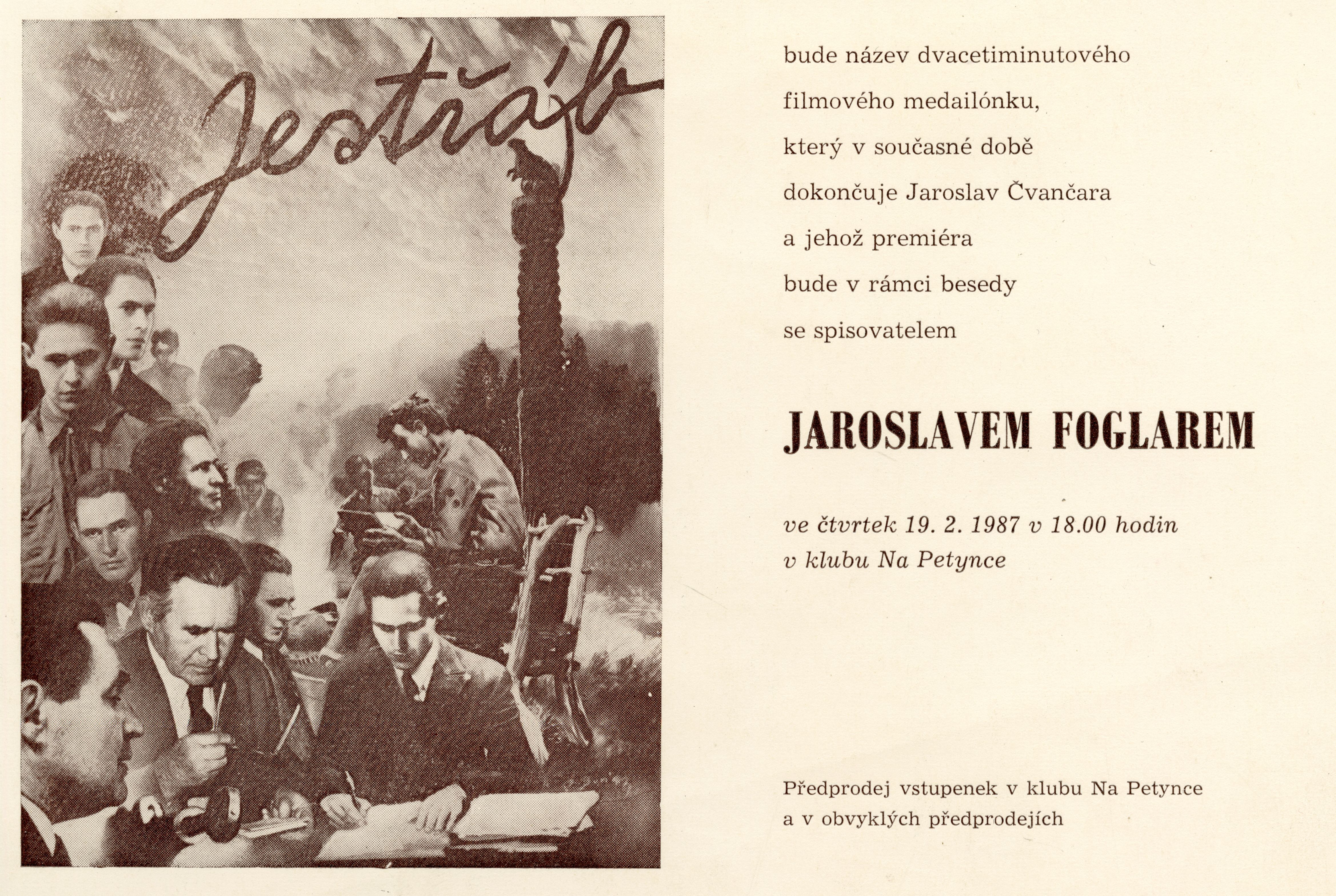 Pozvánka na premiéru filmového dokumentu JESTŘÁB. Jáček ho začal natáčet v roce 1981 a dokončil v únoru 1987. Archiv: Jaroslav Čvančara.