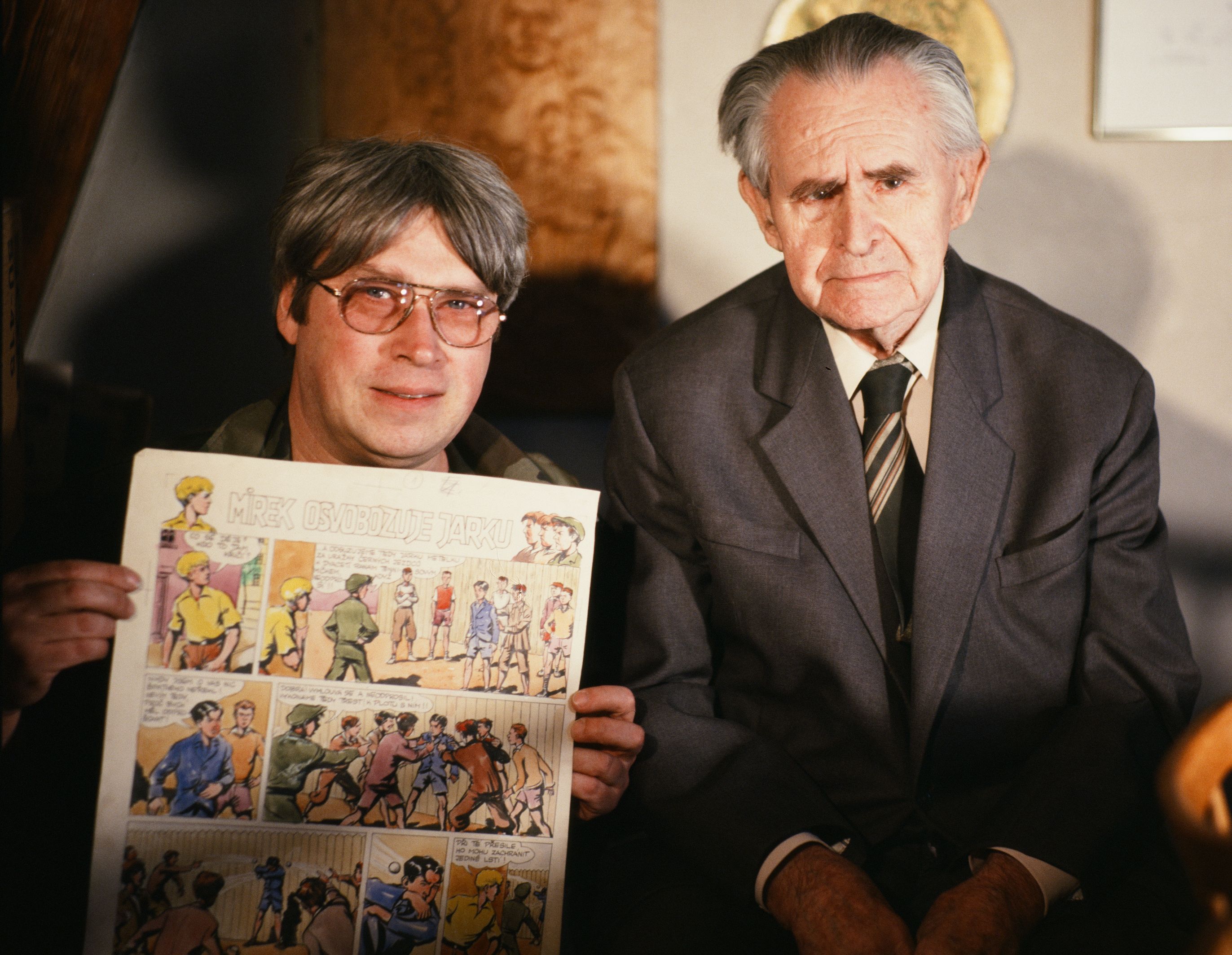 13. 4. 1996. Jestřáb a Jáček s originál Fischerovou ilustrací Rychlých šípů. Foto Dušan Dostál.