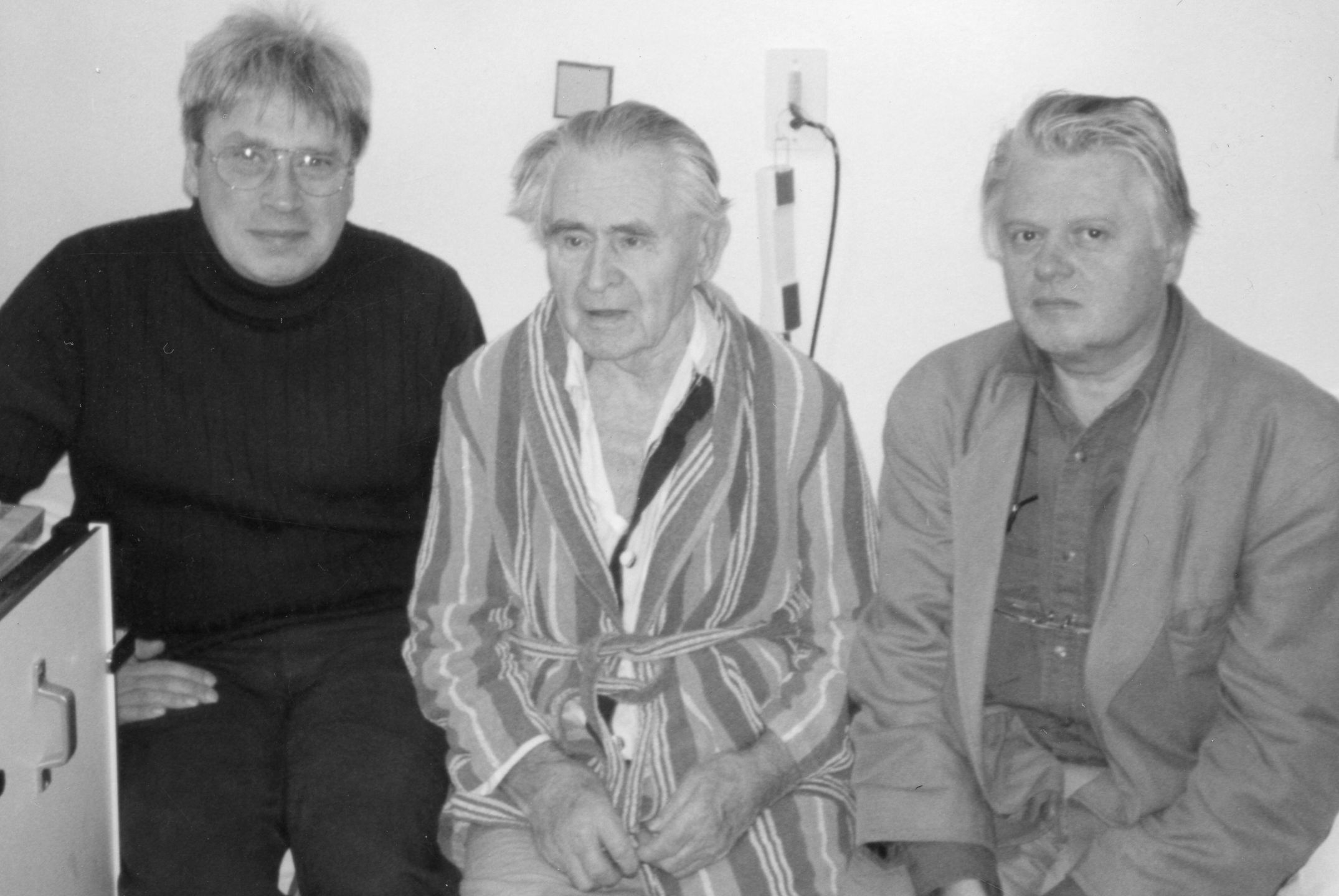 Thomayerova nemocnice, prosinec 1996. Jáček, Jestřáb a režisér Hynek Bočan, tvůrce filmového dokumentu Tábor Černého delfína a televizního seriálu Záhada hlavolamu. Foto: Jiří Raba.