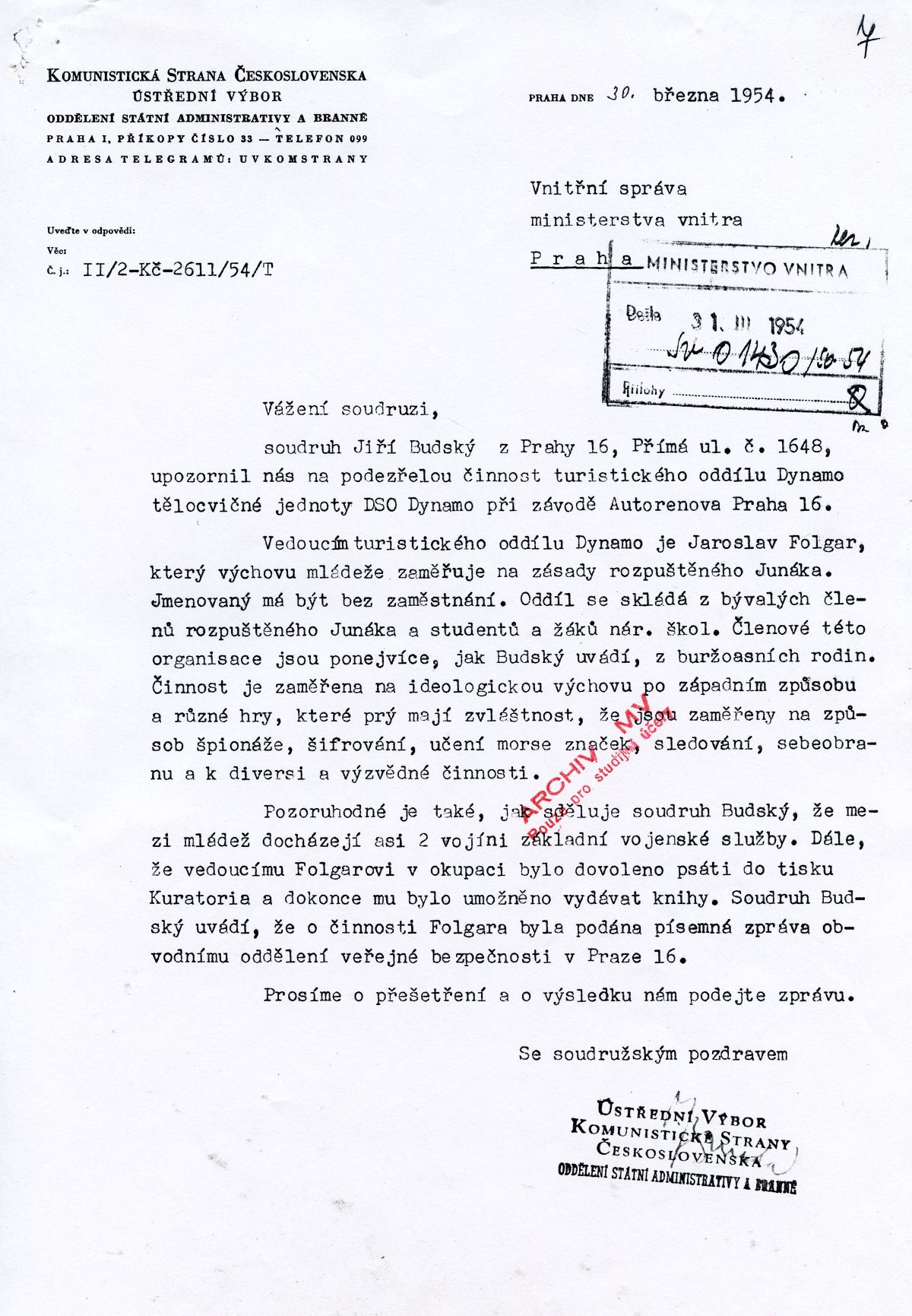 Jeden z dokumentů, o kterých Jiří Stegbauer píše, že neexistují! O kterých tvrdí, že je Jáček nikdy nemohl vidět! Tento dokument je spolu s dalšími uložen v Archivu bezpečnostních složek. Jde o udavačský dopis z 30. 3. 1954 určený ÚV KSČ. Upozorňuje na podezřelou činnost oddílu a JF. Udavač poukazuje, že výchovu mládeže Foglar zaměřuje na zásady zakázaného Junáka. Archiv: ABS.