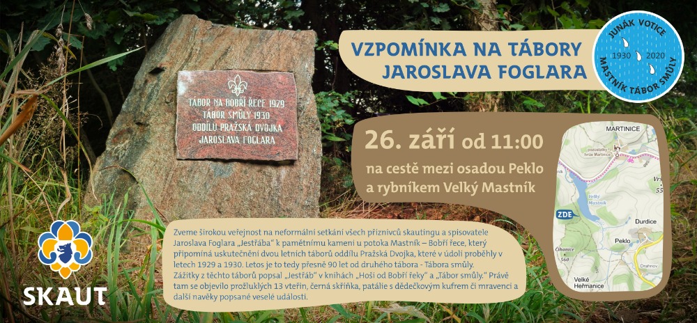 Setkání v sobotu 26. září u pamětního kamene na potoce Mastníku připomínajícího Tábor na Bobří řece 1929 a Tábor smůly 1930[ Autor: Pražská pobočka SPJF | zařazeno: 13. 9. 2020 | přečteno 8842 ] V září roku 2012 došlo k slavnostnímu odhalení pamětního táborového kamene u cesty nad potokem Mastník poblíž osady Peklo u Heřmaniček nedaleko Votic. Kámen zde připomíná Tábor na Bobří řece konaný v roce 1929 a Tábor smůly z roku 1930, které v těchto místech uspořádal skautský oddíl Pražská Dvojka pod vedením Jaroslava Foglara – Jestřába. Tábor smůly s mladistvým humorem popsal Jestřáb v povídkách sestavených do stejnojmenné knihy. Právě zde se objevilo prožluklých 13 vteřin, černá skříňka, patálie s dědečkovým kufrem či mravenci a další navěky popsané veselé události. V průběhu babího léta v sobotu 26. 9. 2020 se u pamětního kamene od 11 hodin uskuteční neformální setkání Jestřábových příznivců u příležitosti osmého výročí vzniku obelisku a devadesátého výročí Tábora smůly. Účastníci si kromě jiného budou moci prohlédnout výstavku z dobových materiálů z obou táborů, absolvovat foglarovský kvíz, zahrát si drobné hry... Sraz účastníků je v uvedenou hodinu přímo na místě. Obelisk je umístěný kousek před začátkem lesa, kde právě končí pastvina svažující se dolů k potoku, těsně vpravo od okraje polní cesty, která začíná za osadou Peklo, vede asi jeden kilometr mírným stoupáním pastvinou na levém břehu (orientováno dle směru chůze) potoka Mastník směrem k rybníku Mastník. Místo lze dohledat dle údajů: 49°37’18.78“ N, 14°34’22.50“ E. Malá osada Peklo, kde je případně nutné ohleduplně zaparkovat automobily, leží u silnice č. 121 vedoucí z Heřmaniček směrem na Votice. Nejbližší železniční zastávka jsou Heřmaničky, odkud na tábořiště vyrážela i Pražská Dvojka. V této souvislosti nelze nezmínit, že nádraží v Heřmaničkách – jakož i část celé tratě, na níž toto nádraží leží – čeká po dokončení finišující modernizace traťového úseku zrušení, koleje povedou jinudy. Přesná poloha tábořiště samotného - leží asi 100 m dolů od kamene u okraje lesa na břehu potoka Mastník – Bobří řece – byla lokalizována na základě podrobných rozborů historických pramenů na jedné z výprav po tábořištích Pražské Dvojky před jedenácti roky pořádanými Pražskou pobočkou Sdružení přátel Jaroslava Foglara. Tábořiště od té doby připomíná dřevěná tabulka s názvem a znakem tábora. Instalací kamene v roce 2012 se završilo dlouhodobé úsilí započaté dřívějším vůdcem skautského střediska Úsvit Votice Pavlem Linhartem – Čertem, iniciátorem celého projektu, jehož nadšení pro věc bylo náhle přerušeno jeho nenávratným odchodem v dubnu téhož roku. Čert byl dlouholetým členem Sdružení přátel Jaroslava Foglara a jeho Pražské pobočky. Ta se tak od počátku stala spolupracujícím partnerem po odborné foglarovské stránce. Díky aktivnímu převzetí štafety po Pavlu Linhartovi členkou votického střediska Marií Šustrovou se kámen v původně uvažovaném časovém rozmezí na přelomu léta a podzimu roku 2012 u Mastníku nakonec úspěšně usadil – na připomínku dávných, ale i nebývale současných táborových taškařic. Na výrobu pamětního kamene v duchu svých dlouhodobých záměrů trvalé propagace myšlenek Jaroslava Foglara – Jestřába přispělo Sdružení přátel Jaroslava Foglara. Na setkání se těší skautské středisko Úsvit Votice a Pražská pobočka Sdružení přátel Jaroslava Foglara. Informace o tábořišti na Mastníku si lze – vedle souvisejících článků uvedených níže - přečíst i v článku Další průzkumné výpravy na letní tábořiště Foglarovy Dvojky: Tábor na Bobří řece a Mohykánský tábor z 11. 11. 2009 zde: http://www.bohousek.cz/clanek-2009110011-dalsi-pruzkumne-vypravy-na-letni-taboriste-foglarovy-dvojky-tabor-na-bobri-rece-a-mohykansky-tabor.html ![]() Foto: Milan Lebeda, září 2012 |