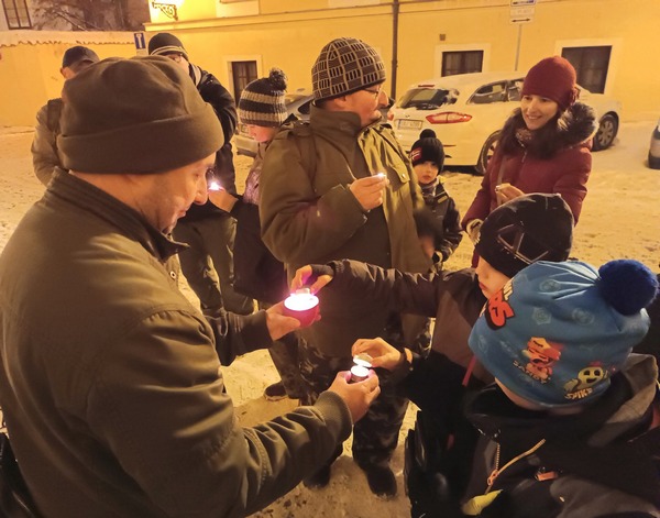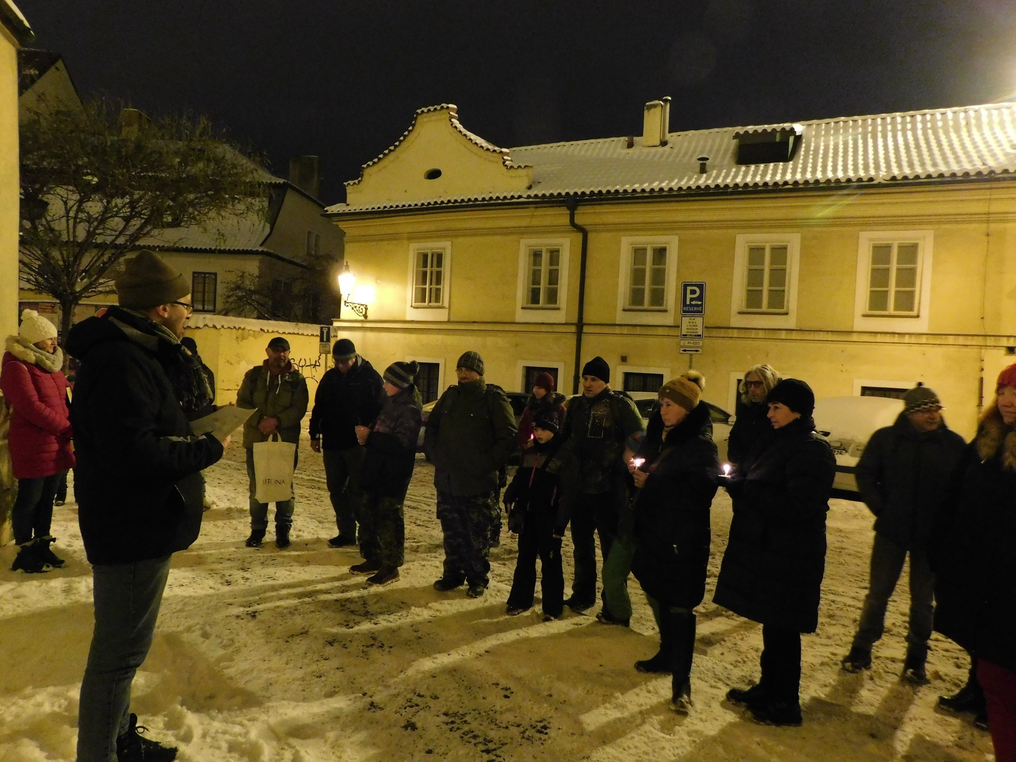 Pražský Večer světel 2022: Zasáhli do hledání Rychlých šípů kolem Haštala Vontové?[ Autor: Bohoušek | zařazeno: 18. 12. 2022 | přečteno 8703 ] Další kapitola do kroniky Večerů světel byla napsána. Po dvouleté pauze vyvolané částečně covidovou pandemií připravila Pražská pobočka SPJF tradiční Večer světel, připomínku výročí vydání prvního příběhu Rychlých šípů na stránkách časopisu Mladý hlasatel (17. 12. 1938). Organizace letošního ročníku se ujal Tomáš Hromádka - Krizmen, který celým večerem provázel a také na závěr připravil pátrací hru v uličkách, kdy bylo možné hledat slavnou pětici chlapců pomocí QR kódů na mobilních telefonech. V úvodu krátce zavzpomínal na historii Večera světel - jak na stránkách foglarovské trilogie, tak v reálném světě, shrnul foglarovské dění v letošním roce a vyhlásil příští rok jako "Rok s Rychlými šípy" - v roce 2023 uplyne nejen 85 let od vydání prvního příběhu, ale také 30 let od premiéry filmu Záhada hlavolamu režiséra Petra Kotka. Téměř třicet přítomných účastníků se mezi sněhovými vločkami na Haštalském náměstí také dozvědělo pravidla populární hry Hledáme Rychlé šípy, která letos probíhá od 17. prosince do 2. února 2023 na Malé Straně jako doprovodná aktivita pátrací hry Skautské nadace Jaroslava Foglara. Následovala pietní připomínka foglarovců, kteří v letošním roce odešli tam, odkud není návratu. Pravidelný účastník Večerů světel - dlouholetý šéfredaktor ABC - Vlastislav Toman zemřel v květnu, fotograf František Dostál v prosinci. Po úvodním slově došlo na slavnostní obřad Večera světel spojený s vyřknutím vontských formulí. Pak Krizmen předal slovo Aleši Deutschovi, který účastníky Večera světel pozdravil za celostátní Vedení SPJF a informoval o zasazení Stromu Jaroslava Foglara na Žižkově dne 18. listopadu 2022. Pro zájemce měl připravené pamětní listy a zajímavé artefakty z celé akce. Na závěr Krizmen popřál přítomným veselé Vánoce, zdraví, štěstí a pohodu v novém roce a vyjádřil přání dalšího setkání na stejném místě a ve stejný čas zase za rok. Po oficiálním ukončení Večera světel se pátrači rozešli do uliček kolem kostela sv. Haštala hledat Rychlé šípy ukryté na žlutých plakátcích. Na každém lístečku byl skryt jeden z pětice z Rychlých šípů, spolu s písmenem do tajenky a QR kódem s nápovědou, kde hledat další postavu. Pět písmen dávalo tajenku: JEŽEK. Tu ale vyluštili jenom nejrychlejší pátrači, protože kdosi v průběhu hry písmena velmi kreativně pozměnil. Byli to Vontové? Kdo ví... To ale Krizmenovi vůbec nevadilo a účastníkům také ne. Magnetky a pamětní odznaky, které vytvořil Petr Molka - Best, dostali všichni.