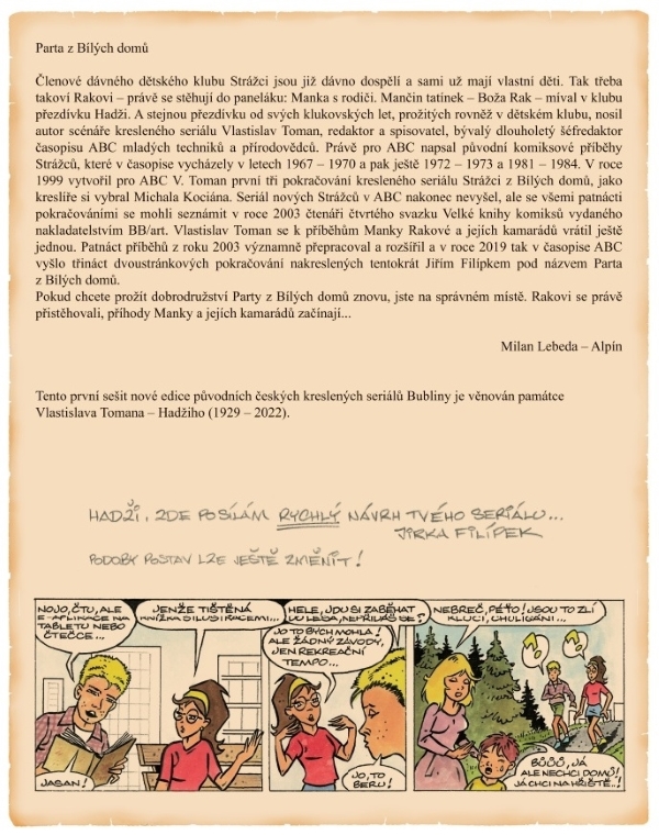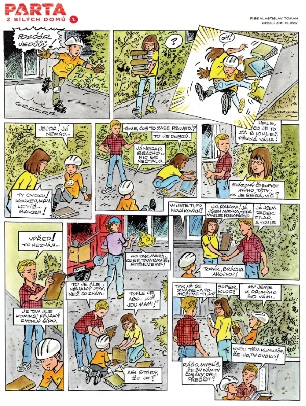Třináct dvoustránkových pokračování kresleného seriálu scénáristy Vlastislava Tomana a kreslíře Jiřího Filípka s názvem Parta z Bílých domů právě vyšlo.