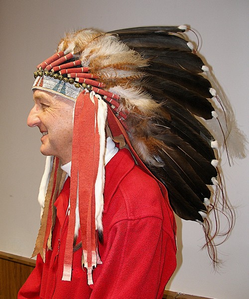 Veliké (před)vánoční překvapení si nakonec pro nás přichystal Luděk Nykles – Viki, když z koženého pouzdra obřadně vyjmul doopravdickou, skutečně pravou indiánskou čelenku s pery, kterou jsme si mohli všichni postupně nasadit a v ní se vyfotografovat. Podobná příležitost se hned tak nikomu nenaskytne a my za ni Vikimu moc děkujeme! Obr. – V indiánské čelence.